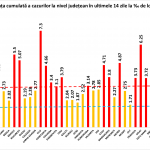Este prezentată incidența cumulată a cazurilor în ultimele 14 zile la mia(‰) de locuitori. Sunt prezentate evoluțiile în timp ale incidențelor pentru București și județul Ilfov. Dedesubt, este prezentat tabloul cu incidențele tuturor județelor din prezent.