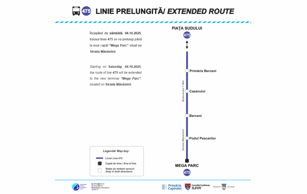 Asociația de Dezvoltare Intercomunitară pentru Transport Public București-Ilfov (TPBI) prelungește traseul liniei 475, din data de 4 octombrie. Aceasta va ajunge până la noul terminal „Mega Parc”, aflat pe raza comunei Vidra, din Județul Ilfov.