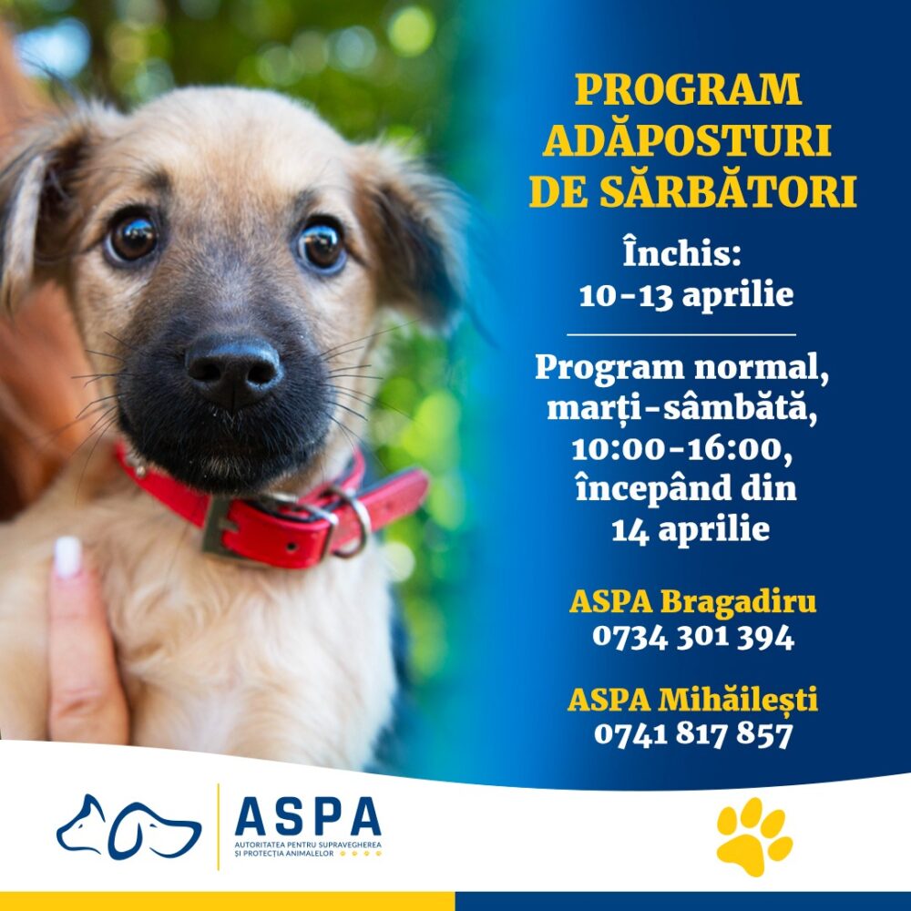 Adăposturile ASPA, respectiv cel din Bragadiru și cel din Mihăilești, vor fi închise publicului în perioada sărbătorilor pascale. Acestea vor reveni la programul normal după Paște.