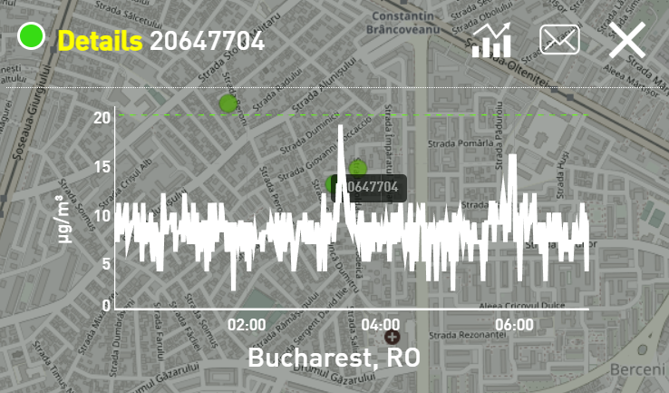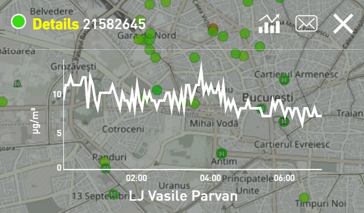 Un senzor amplasat în zona Constantin Brâncoveanu a înregistrat o medie de aproximativ 10 µg/m³ pe parcursul nopții.
