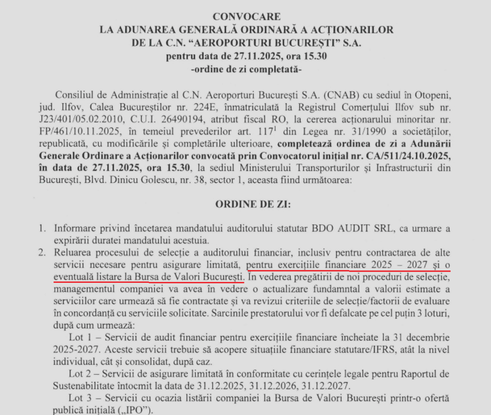 De altfel, Adunarea Generală a Acționarilor a fost deja convocată pentru data de 27 noiembrie în vederea „reluării procesului de selecție a auditorului financiar, inclusiv pentru contractarea de alte servicii necesare pentru asigurare limitată, pentru exercițiile financiare 2025-2027 și o eventuală listare la Bursa de Valori București“, se arată într-un anunț de pe site-ul CNAB.