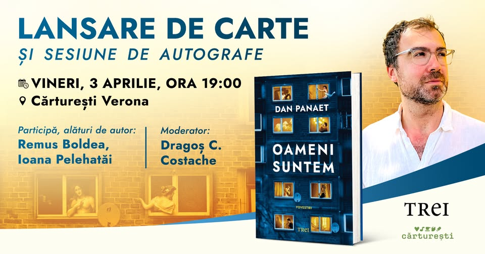 Dan Panaet își lansează volumul „Oameni Suntem” la Cărturești Verona, de la 19. La discuția moderată de Dragoș Costache vor participa Ioana Pelehatăi și Remus Boldea.