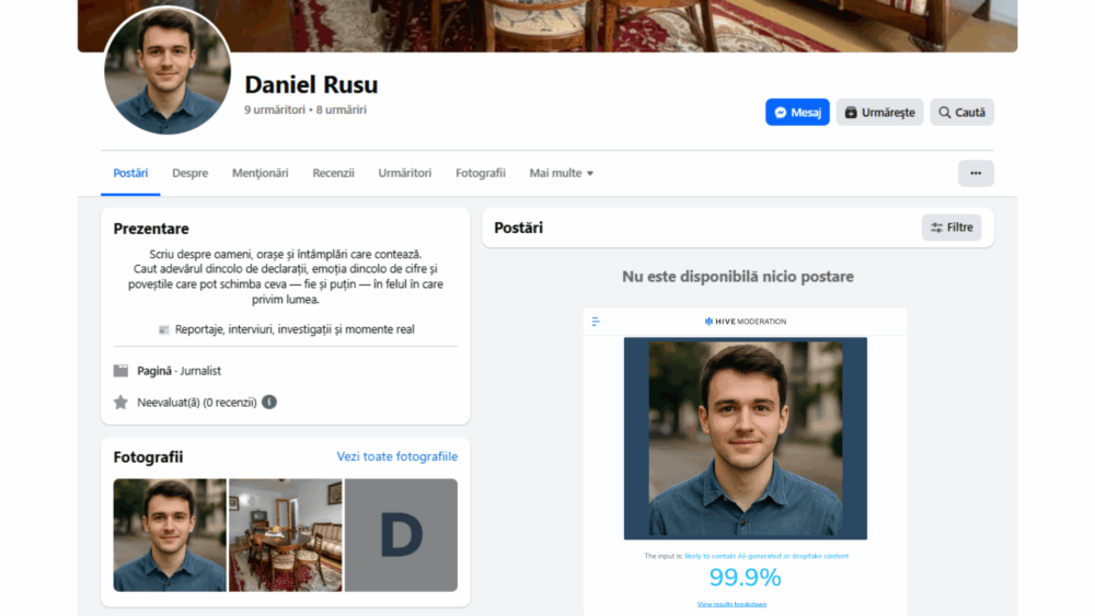 Cercetarea istoricului acestor conturi prin funcția de transparență a paginilor Facebook demonstrează falsul. Profiluri care astăzi poartă nume generice românești și postează mesaje de susținere politică au funcționat anterior ca pagini pentru diverse afaceri sau instituții. Foste pagini de service-uri auto, muzee sau biblioteci au fost redenumite și rebranduite peste noapte. Fotografiile de profil utilizate pentru a umaniza aceste entități prezintă indicii clare ale generării prin AI, o tactică folosită pentru a evita furtul de identitate direct, dar care creează persoane inexistente.