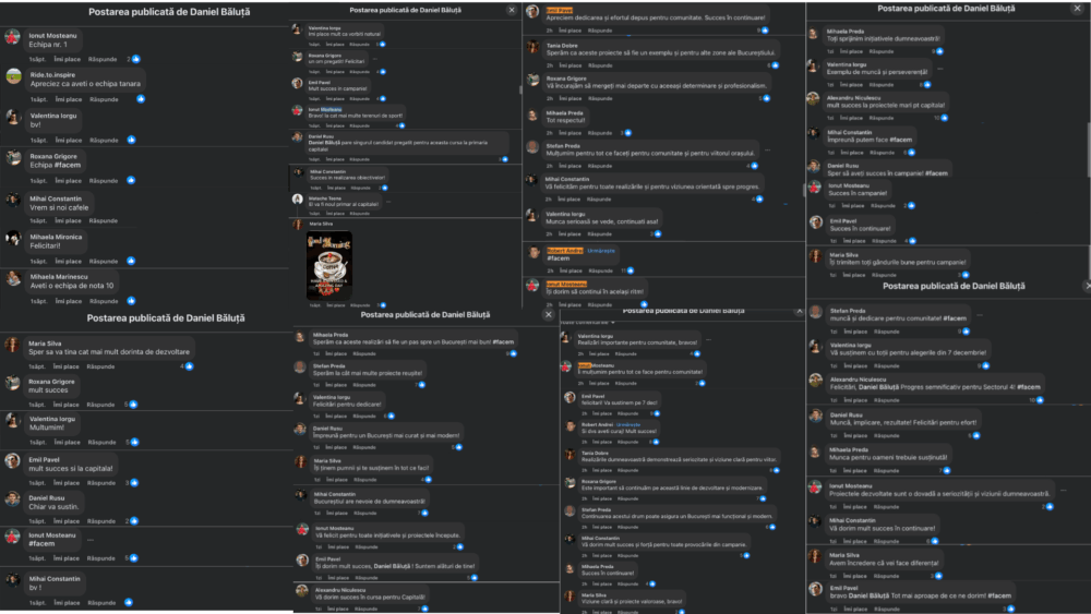 O analiză Funky Citizens a identificat o rețea de peste 30 de conturi false care acționează coordonat pe pagina de Facebook a lui Daniel Băluță, candidatul PSD la primăria generală. Conturile au fost create sau activate într-un interval scurt, imediat după anunțarea calendarului electoral. Mecanismul implică transformarea unor pagini de Facebook comerciale, cum ar fi service-uri și muzee, în profiluri de utilizatori cu nume românești și fotografii generate de AI. Rețeaua simulează interacțiunea umană prin comentarii pozitive, folosirea hashtag-ului #facem și validarea reciprocă a comentariilor pentru a păcăli algoritmii de reach pentru a crește vizibilitatea în feed-ul utilizatorilor reali.