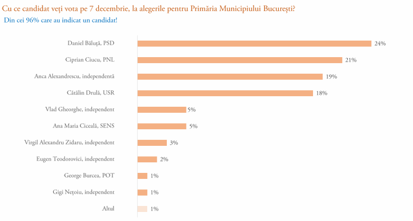Primarul social-democrat al Sectorului 4, Daniel Băluță, ocupă primul loc în preferințele respondenților, cu 24% dintre intențiile de vot. Este urmat îndeaproape de edilul Sectorului 6, Ciprian Ciucu, cu o diferență de doar 3 procente.