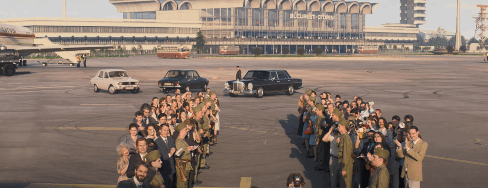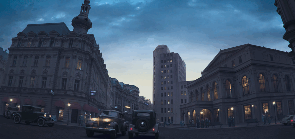 În imagini se observă mașini de epocă, detaliu care subliniază efortul producătorilor de a recrea cu acuratețe acea perioadă.