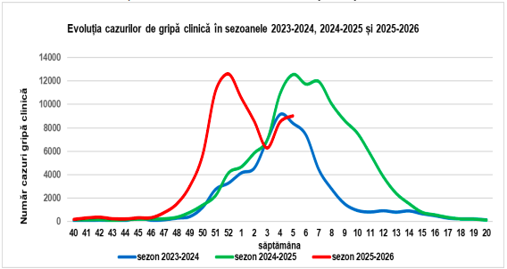 INSP a raportat 9.039 cazuri de gripă clinică la nivel național, comparativ cu 8.499 înregistrate în săptămâna precedentă și cu 12.583 în aceeași săptămână a sezonului precedent și de 1,6 ori mai multe față de media ultimelor cinci sezoane (5.555).