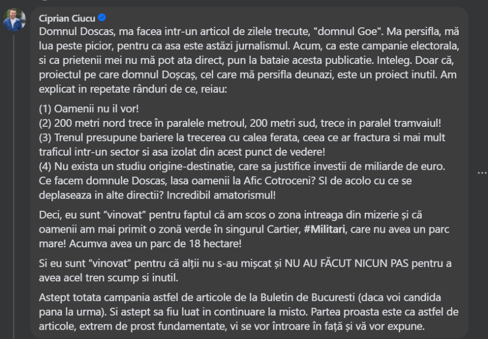 Ciucu invocă argumente de utilitate și eficiență, susținând că proiectul trenului metropolitan este “inutil” și nejustificat de studii origine-destinație.