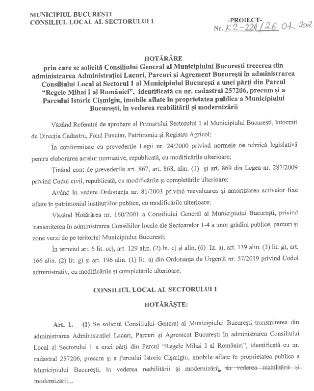 Având în vedere starea deficitară în care se află aleile pietonale ce se pierd printre buruieni și gropi, spațiile verzi, mobilierul urban, locurile de joacă și a grupurilor sanitare ce sunt închise cu lacăt, din cadrul Parcului Istoric Cișmigiu și a Parcului Regele Mihai I este necesară intervenția de urgență a autorității publice de la nivelul Sectorului 1 în vederea remedierii stării de fapt actuale, cât și în vederea reamenajării și sistematizării acestora, având în vedere că se află pe raza Sectorului 1.