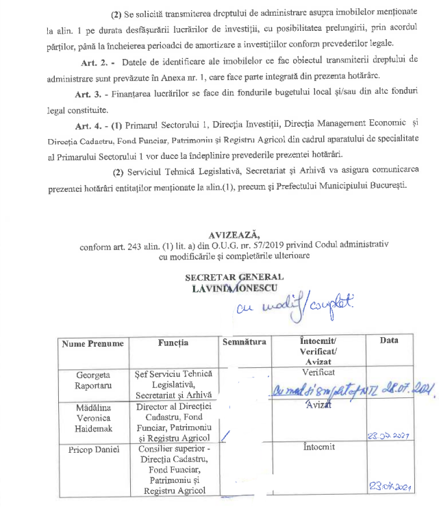 Conform proiectului de hotărâre, primăria Sectorului 1 ar urma să se ocupe și de administrarea celor două parcuri pe perioada desfășurării lucrărilor, cu posibilitatea de prelungire până când banii investiți de primăria condusă de Clotilde Armand sunt amortizați.
