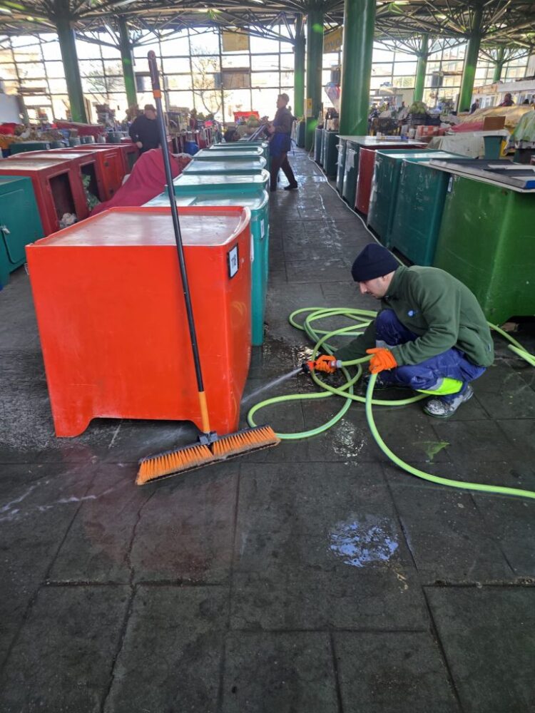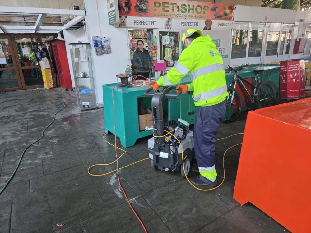 Echipele de intervenție au spălat și degresat cei aproape 2.000 de metri pătrați de paviment, au curățat geamurile și au spălat cele 150 de tarabe. Operațiunea durează aproximativ patru ore, în funcție de suprafața pieței. Curățenia se face la începutul săptămânii.