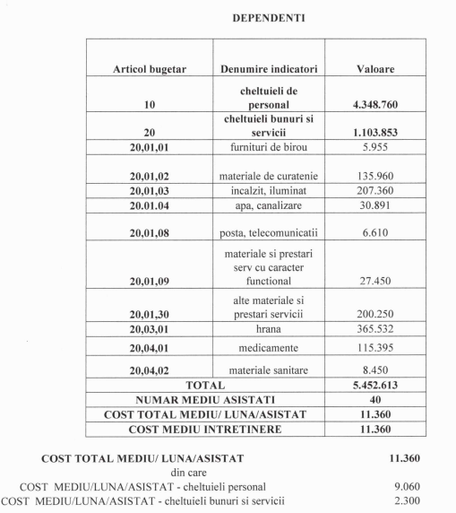 Potrivit documentației proiectului de hotărâre, costul mediu lunar pentru un beneficiar dependent este estimat la 11.360 de lei. Din această sumă, aproximativ 9.060 de lei reprezintă cheltuieli de personal, iar 2.300 de lei sunt alocați pentru bunuri și servicii.