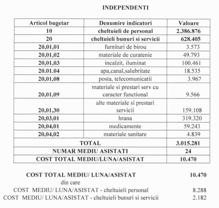 Pentru beneficiarii independenți, costul mediu lunar este de 10.470 de lei, dintre care 8.288 de lei sunt cheltuieli de personal. Suma de 2.182 de lei este alocată bunurilor și serviciilor.