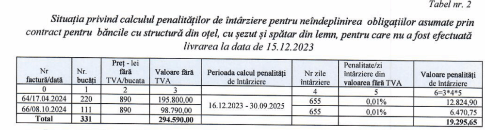 Restul de 331 au fost livrate după expirarea contractului, însă nu au fost recepționate nici măcar anul acesta. ALPAB a refuzat să plătească produsele facturate în 2024, din cauza deficiențelor constatate la recepție: „crăpături apărute în riglele de lemn, decojirea vopselei aplicate pe bănci și șuruburi lipsă”.