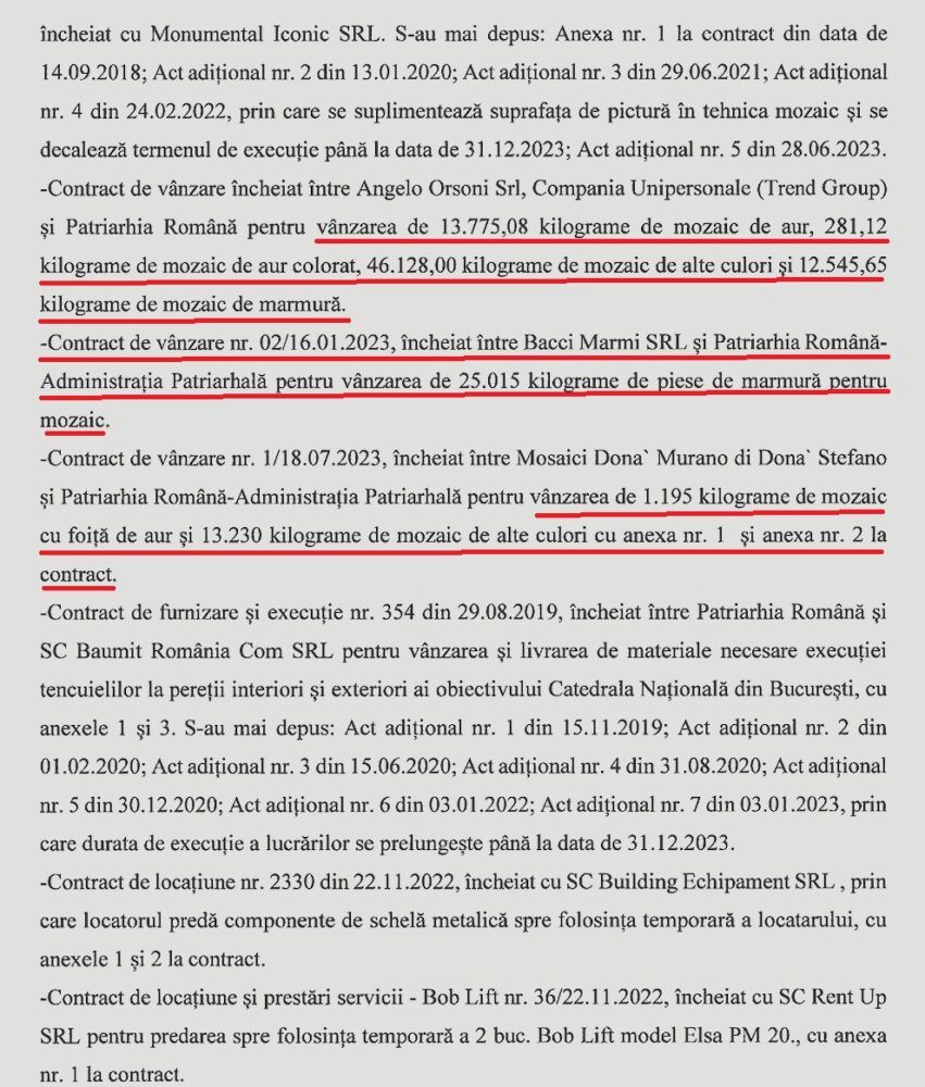 Doar în perioda 2018-2023, BOR a cumpărat cantități impresionante, inclusiv 13.775,08 kg de mozaic de aur, 281,12 kg de mozaic de aur colorat, 46.128,00 kg de mozaic de alte culori și 12.545,65 kg de mozaic de marmură de la o singură companie.