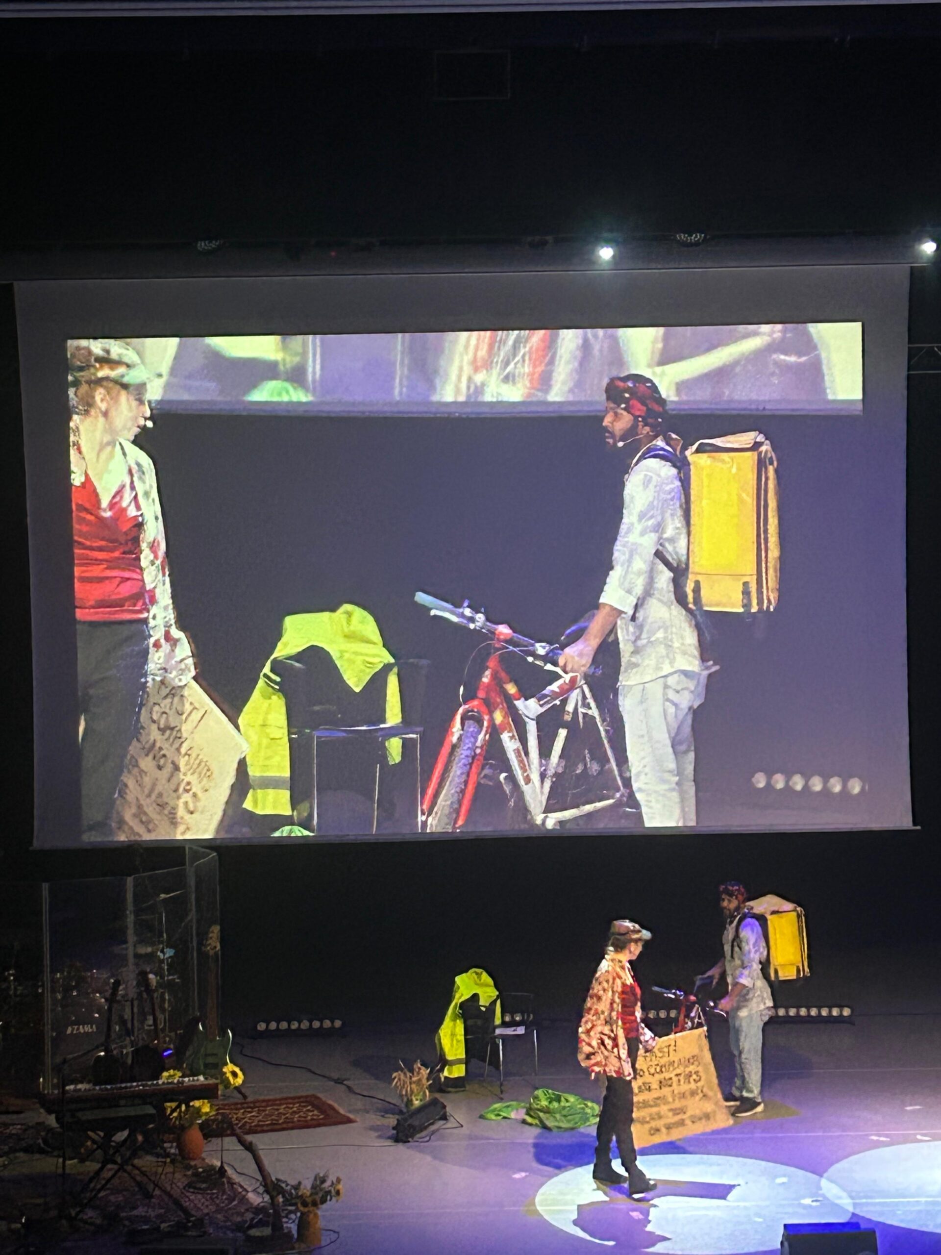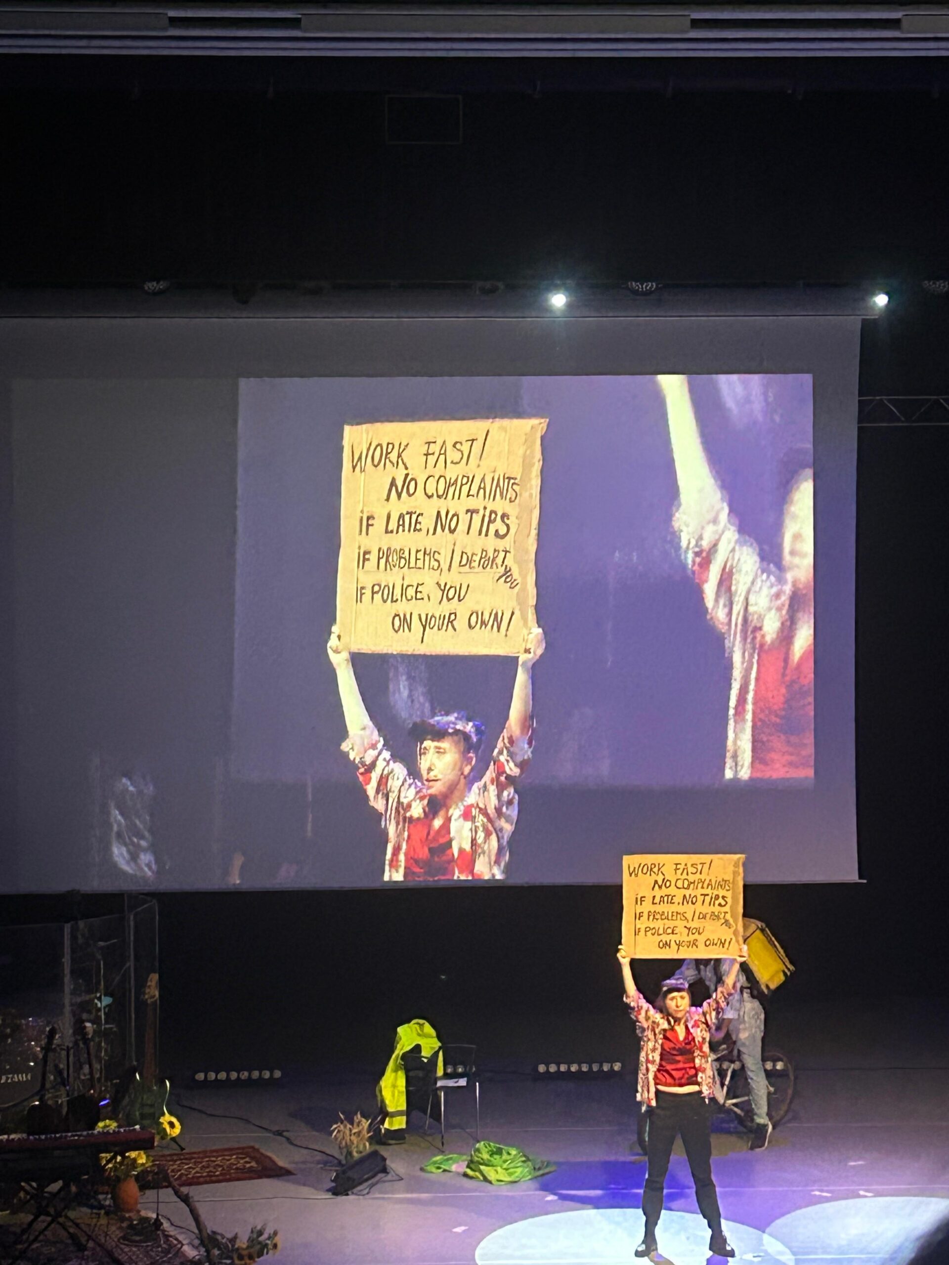 Deși o piesă de teatru, momentul nu avea nimic „teatral” în el. Omul de pe scenă putea fi oricare dintre băieții pe care îi vezi zilnic cu rucsacul termic în spate. Am aflat cu această ocazie cât de ușor poate fi deportat un muncitor străin din cauza firmelor care nu depun la Inspectoratul General de Imigrări documentația de care e nevoie în 90 de zile.