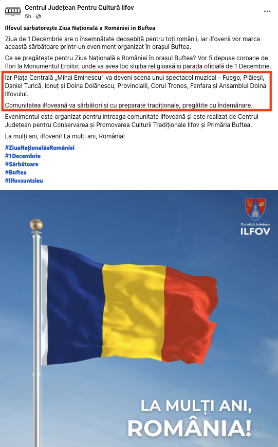 - În completare, primarul Gheorghe Pistol, colegul de partid al președintelui CJ Thuma, a plătit din bugetul local al orașului Buftea peste 30.000 euro pentru „un spectacol muzical” susținut printre alții, de Fuego și Tronos, corul oficial al Patriarhiei.