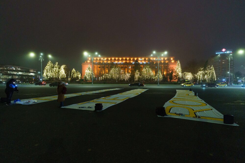 Imaginile surprinse de fotoreporterii Inquam Photos arată trei fâșii de pânză, de aproximativ trei metri lățime și 25 de metri lungime fiecare, care au fost desfășurate pe asfaltul din piața Victoriei.