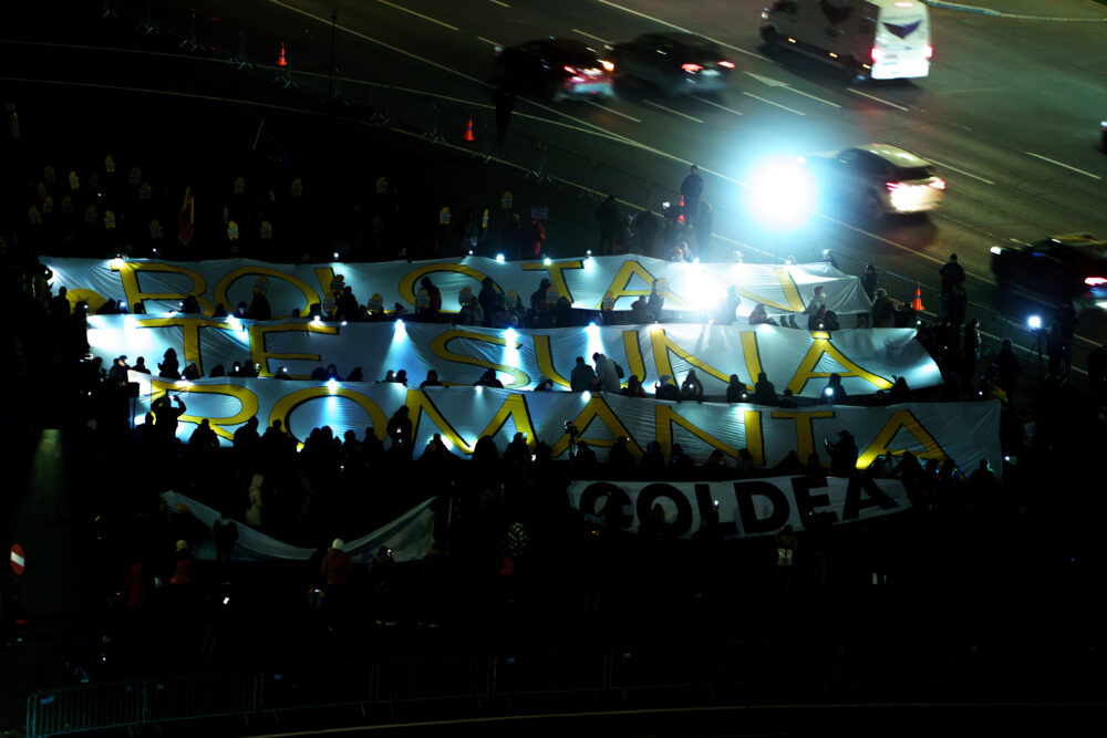 Mesajul „BOLOJAN, TE SUNĂ ROMÂNIA” a fost luminat de lanternele telefoanelor.