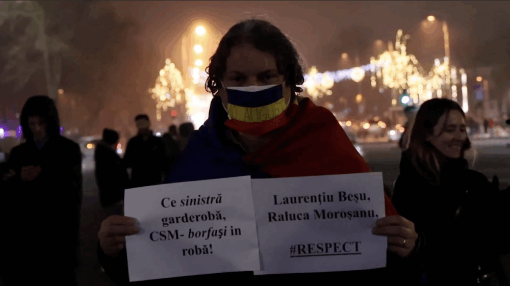 Protestul a început cu scandări dedicate judecătoarei Raluca Moroșanu, magistrat al Curții de Apel București, care a intervenit joi, în timpul unei conferințe de presă a instituției, pentru a-și susține colegul, Laurențiu Beșu.