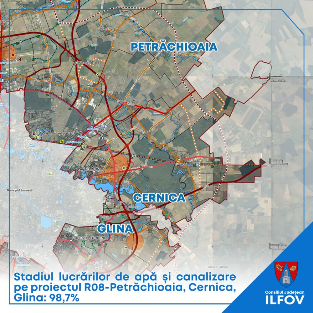 Este vorba despre localitățile Petrăchioaia, Cernica și Glina, unde lucrările au ajuns la un progres fizic de 98,70%, fiind în etapa finală de execuție.