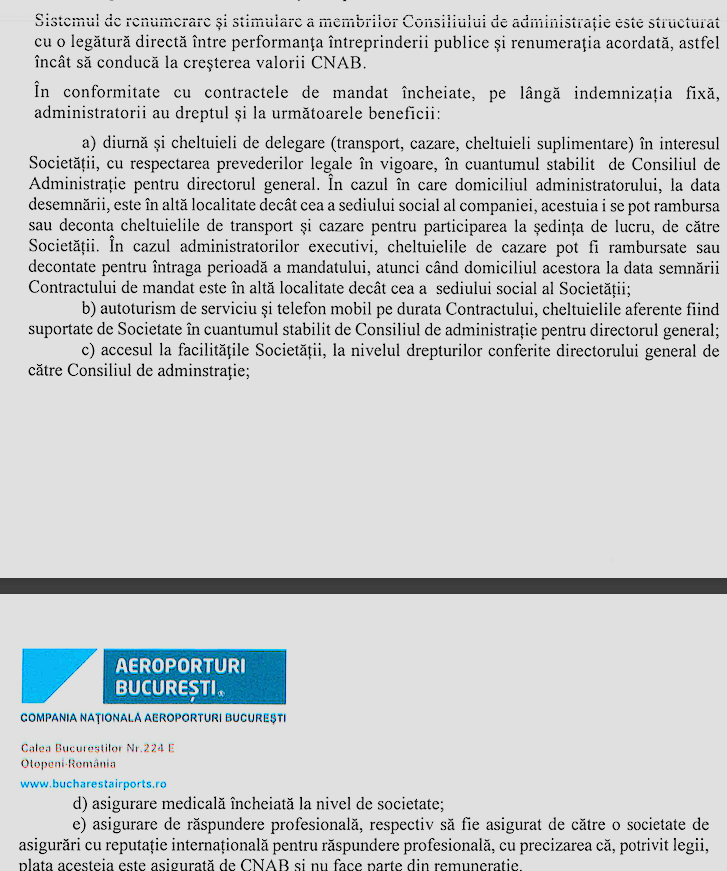 Șefii Companiei Naționale Aeroporturi București (CNAB) beneficiază de „componente non-financiare” care elimină aproape orice cheltuială personală legată de transport sau comunicații. Atât directorii, cât și administratorii au dreptul contractual la un autoturism. Directorii și la șofer personal.