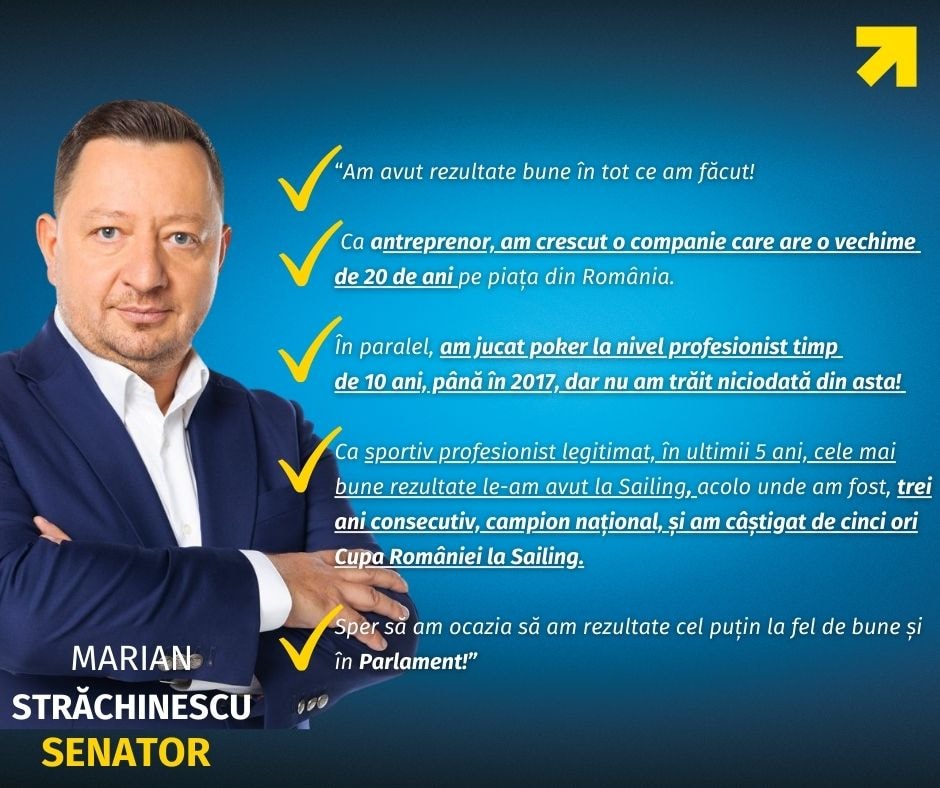 - Marian Străchinescu a intrat recent în politică ,după ce „și-a agățat în cui” cariera de jucător profesionist de poker. Alexandru Popa, șeful PNL Brăila „i-a întins o mână de ajutor” în 2024, când l-a pus pe prima poziție pe lista PNL pentru Senatul României la alegerile parlamentare din 2024. Totuși, nu a reușit să prindă loc în legislativul țării și s-a retras la scurt timp din partid.