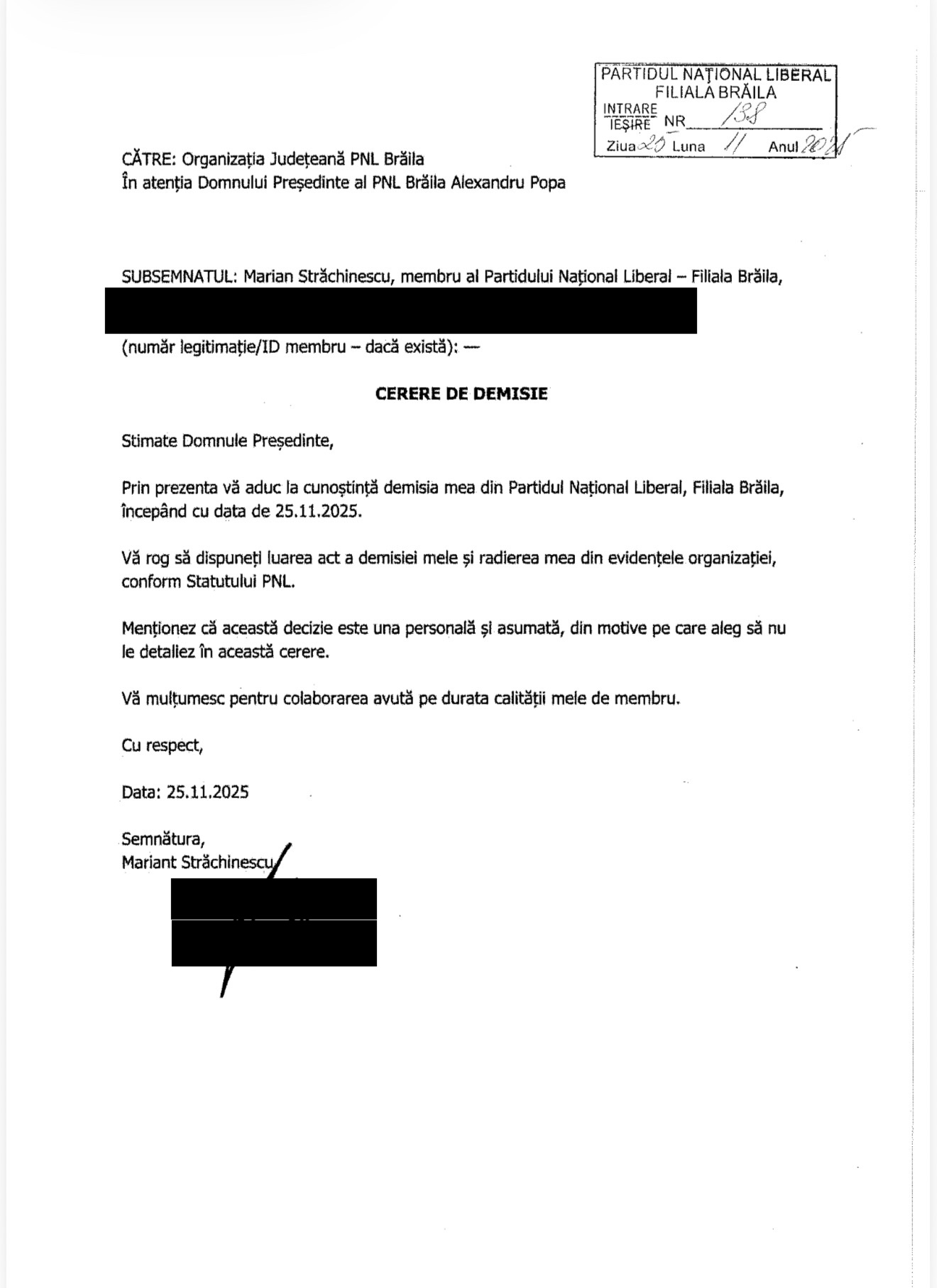 Marian Străchinescu a declarat că locul său pe listele PNL de la Senat nu a fost condiționat de sumele cu care a contribuit la campanie, iar banii i-au fost restituiți integral la finalul campaniei. Acesta susține și că a demisionat din partid la aproape un an de la finalizarea alegerilor parlamentare din 2024. Mai jos, publicăm și demisia primită de la acesta.