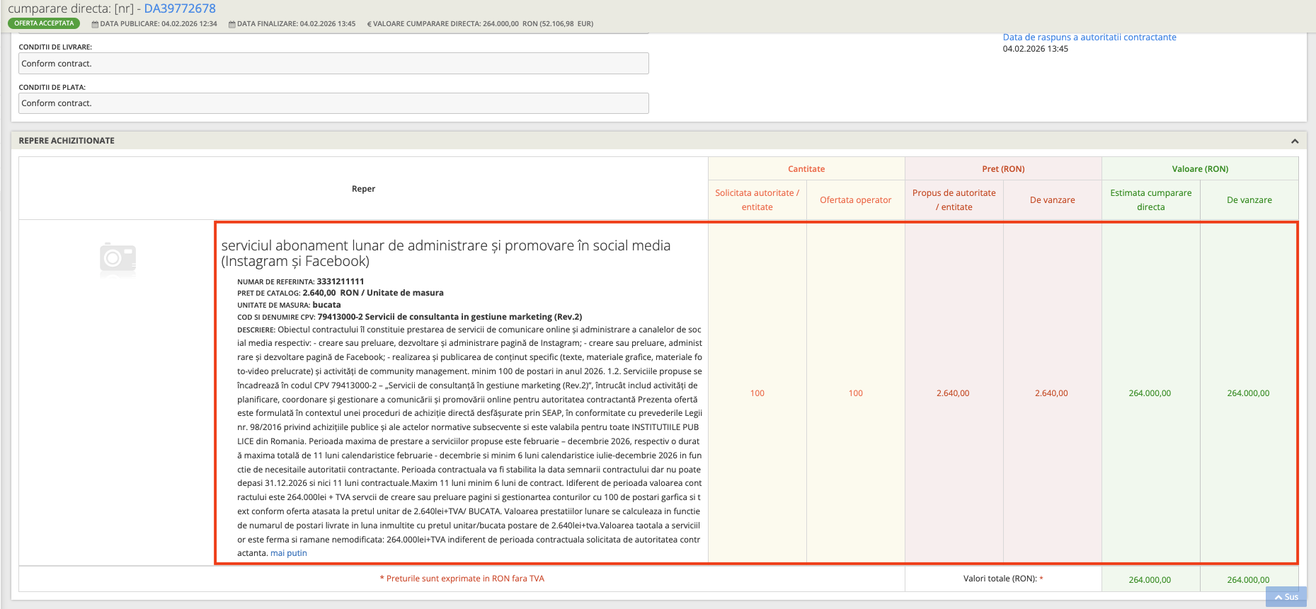 - Cele două anunțuri par aproape trase la indigo. Firma fostului candidat PNL trebuie să facă minimum 100 de postări pentru fiecare instituție în parte pe Facebook și Instagram până la final de 2026.