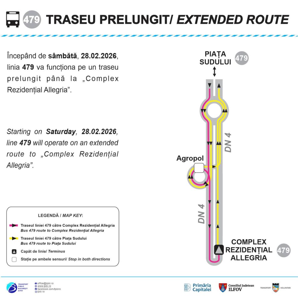 Asociația de Dezvoltare Intercomunitară pentru Transport Public București-Ilfov (TPBI) a anunțat că linia 479 va fi prelungită până la Complexul Allegria.