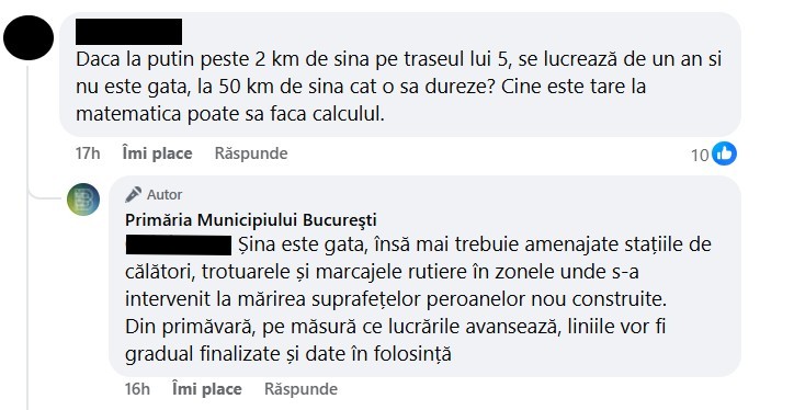 În secțiunea de comentarii a postării Primăriei, un utilizator a adus în discuție situația de pe linia 5. Acesta s-a întrebat cum ar putea Primăria Capitalei să reabiliteze 50 de kilometri de șine, având în vedere că circulația încă nu s-a deschis pe linia 5, după atâta timp.