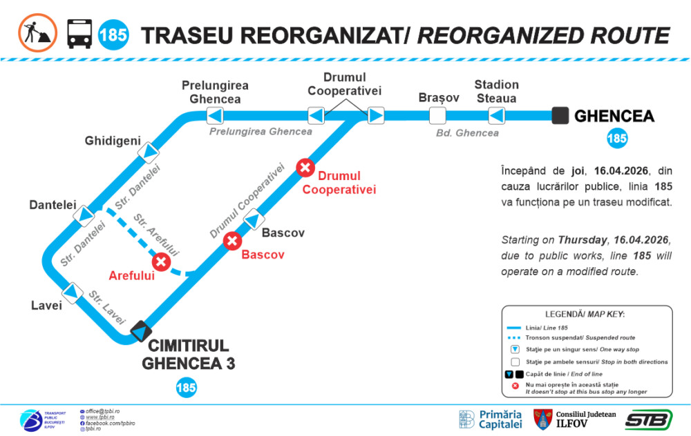 Începând de joi, 16 aprilie 2026, linia de autobuz 185 va funcționa pe un traseu deviat temporar pe sensul către „Cimitirul Ghencea 3”, după cum a anunțat Asociația de Dezvoltare Intercomunitară pentru Transport Public București – Ilfov (TPBI).