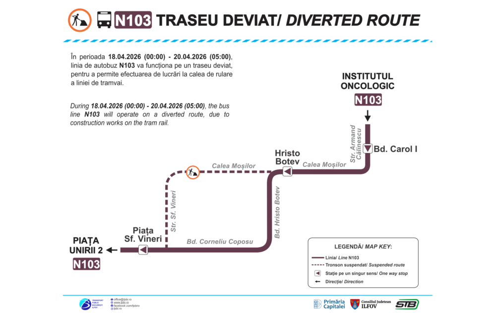 • Linia N103 va funcţiona, ȋn nopţile de 17/18.04.2026, 18/19.04.2026 şi 19/20.04.2026, pe traseul de bază ȋntre „Institutul Oncologic” şi intersecţia Calea Moşilor/ Bd. Hristo Botev, apoi pe un traseu modificat pe sensul spre Piaţa Unirii 2, pe  Bd. Hristo Botev, Bd. Corneliu Coposu, Piaţa Unirii, „Piaţa Unirii 2”. Pe sensul opus, traseul nu va fi modificat.