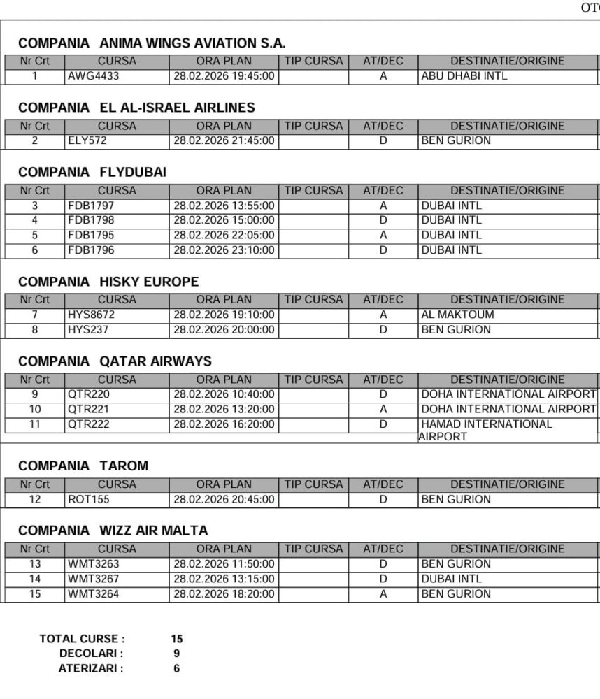 UPDATE 17:00: În cursul zilei de 28 februarie, au fost anulate 15 curse aeriene, dintre care nouă decolări și șase aterizări.