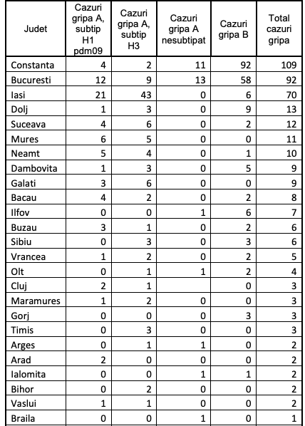 La nivel național, numărul total de cazuri de infecții respiratorii acute (cazuri gripă/ cazuri compatibile clinic cu gripă, IACRS și pneumonii) a fost de 111.612, cu 8% mai mai mare față de cel înregistrat în săptămâna precedentă și cu 45% mai mare comparativ cu cel înregistrat în aceeași săptămâna a sezonului precedent