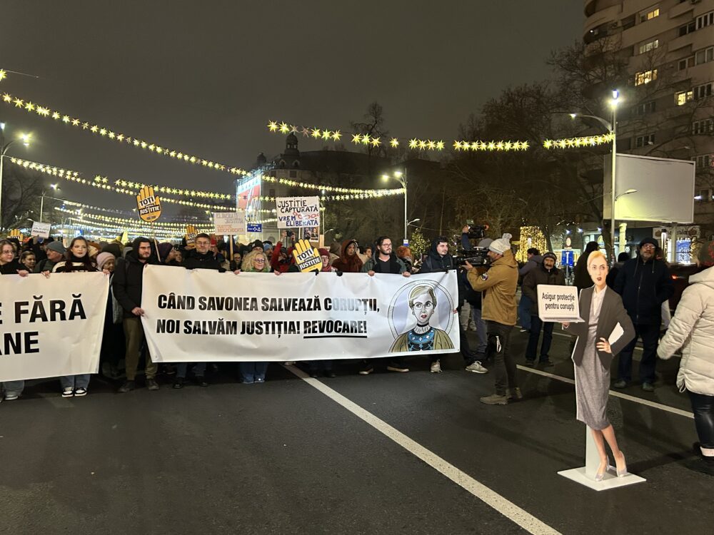 UPDATE 21.00: Protestatari au pancarte cu mesajele „Justiție fără telefoane” și „Când Savonea salvează corupții, noi salvăm Justiția! Revocare”, „Toți pentru justiție”, „Justiție capturată, o vrem eliberată”, „Justiția asigură protecție pentru corupți”, „Justiție independentă”.