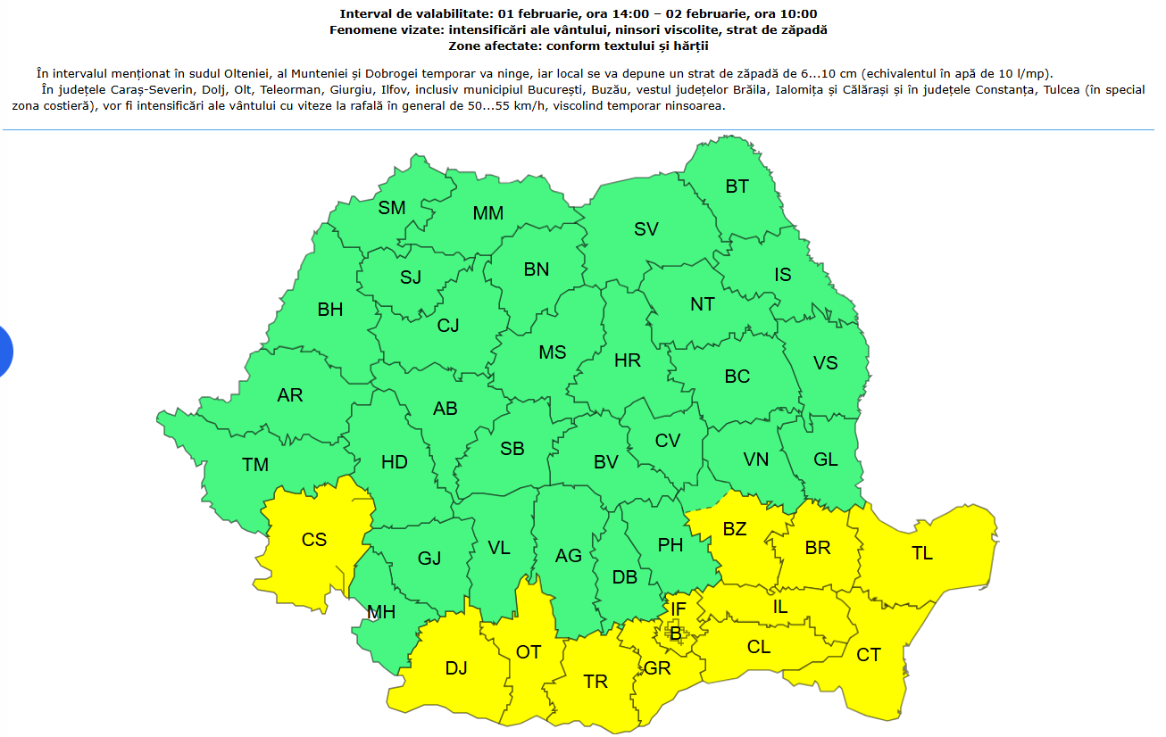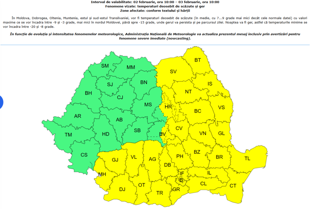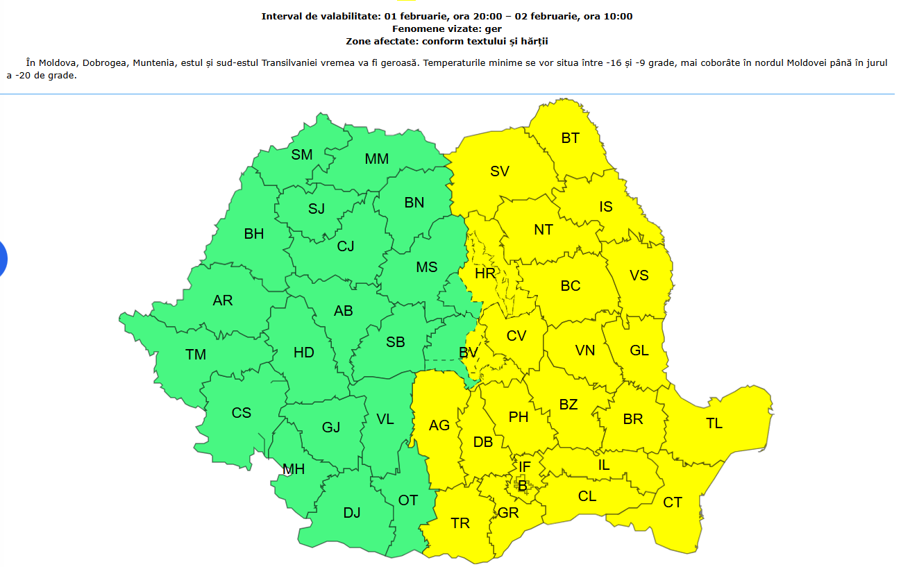 Totodată, gerul se extinde şi în sudul şi nord-estul țării, potrivit avertizărilor emise de ANM.