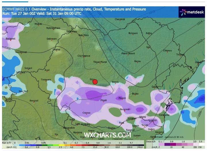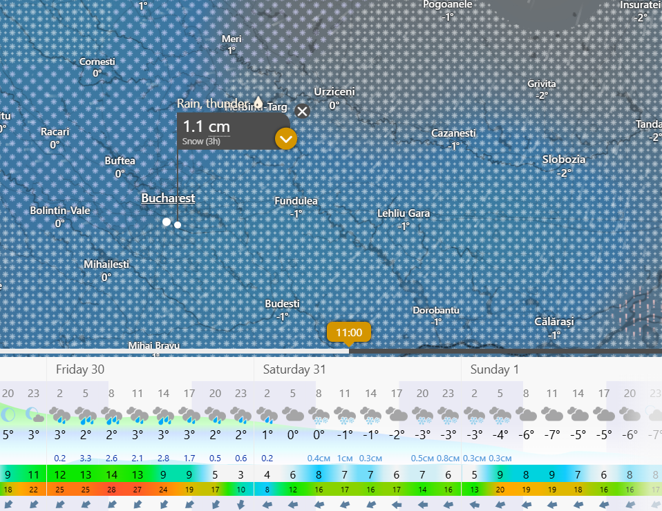Conform hărții windy.com, începând de sâmbătă, 31 ianuarie, vor fi și precipitații sub formă de ninsoare în Capitală, încă de la primele ore ale dimineții.