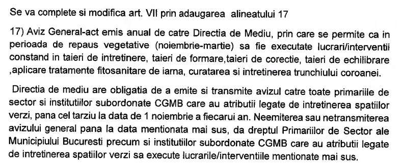 Prin intermediul a două amendamente, consilierul general Nițu Răzvan a reintrodus „avizul general”. Practic, primăriile de sector și instituțiile din subordine și implicit, firmele contractate pentru întreținerea arborilor, plătite la cantitatea de crengi tăiate, vor putea executa lucrări de toaletare, după bunul plac, timp de cinci luni din an, în perioada noiembrie-martie.