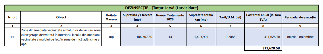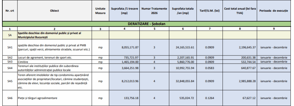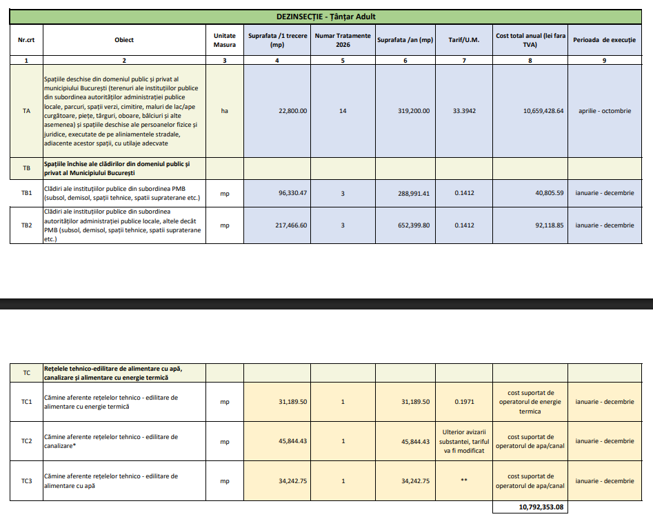 Costurile totale pentru dezinsecție, dezinfecție și deratizare se ridică la 27,6 milioane de lei, echivalentul a 5,5 milioane de euro. Suma este cu circa 1,7 milioane de lei, mai mică față de cea prevăzută în programul unitar de acțiune aferent anului 2025.