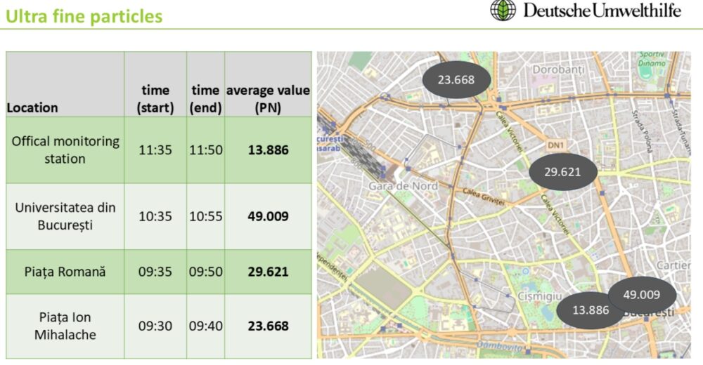 Valori deosebit de mari au fost înregistrate în trei zone din centrul Capitalei, și anume Piața Victoriei, Piața Romană și Universitate. Aici, concentrațiile de PM 0,1 au depășit de 10 până la 20 de ori valorile recomandate de Organizația Mondială a Sănătății (OMS) pentru protejarea sănătății umane (1000-2500 particule/ cm3).