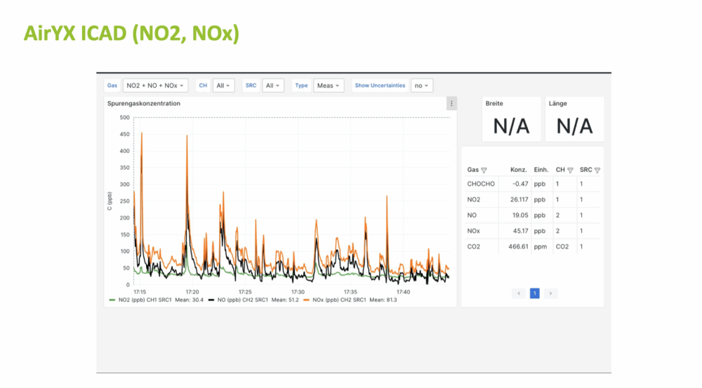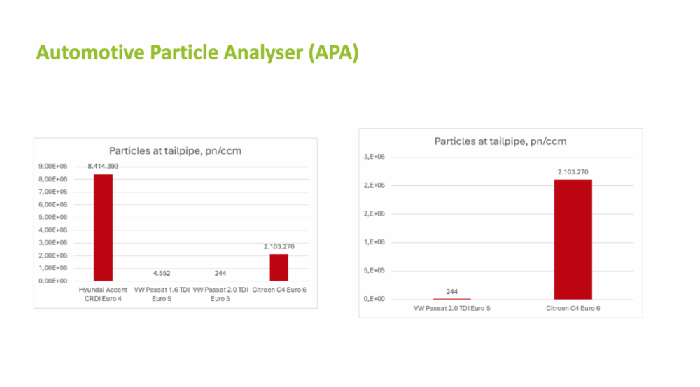 Măsurătorile au fost realizate cu aparatul Automotive Particle Analyzer (APA) și cu analizorul AirYX ICAD pentru NOx. Au fost observate vârfuri clare de poluare generate în special de traficul rutier și de mașini diesel care nu dispun de filtre de particule, fie din cauza modelului vechi, fie căci le-au fost scoase.