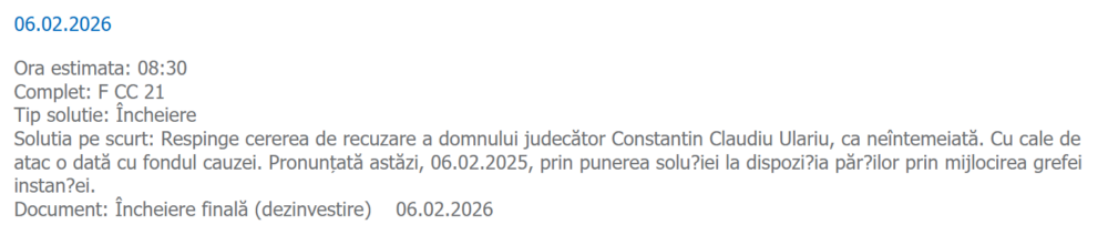 Când instanța a respins aceste argumente, apărarea lui Băjenaru a solicitat schimbarea judecătorului Constantin-Claudiu Ulariu, invocând lipsa de imparțialitate și antepronunțarea.
