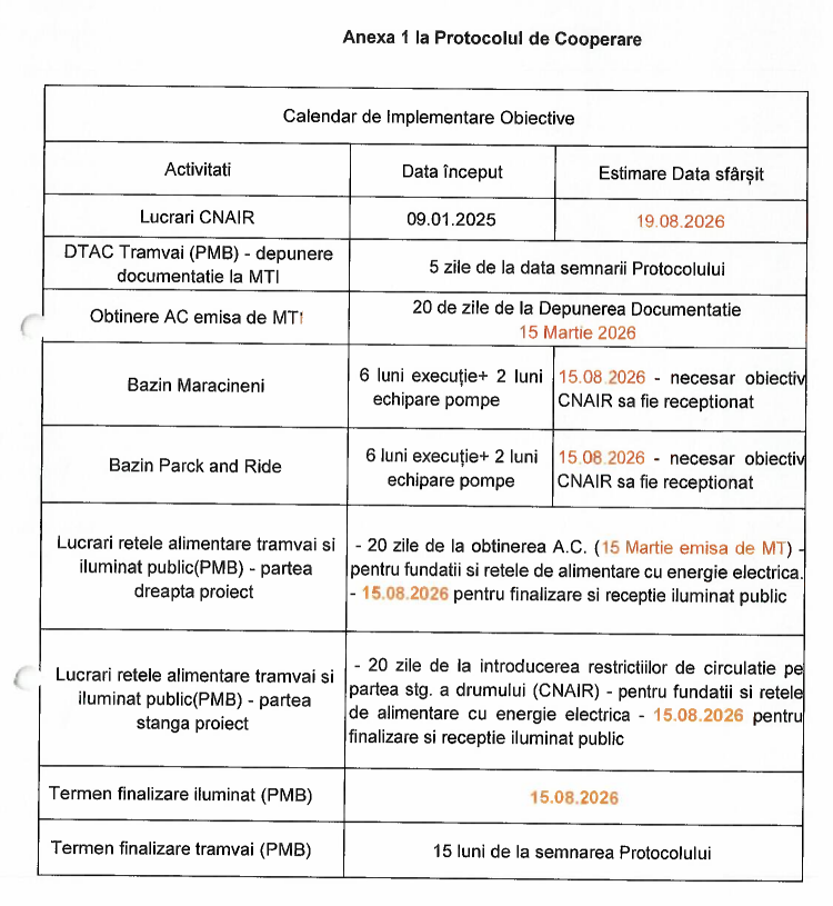 Documentul prevede și un calendar comun de implementare, pentru ca eventualele întârzieri înregistrate pe șantierul liniei de tramvai să nu afecteze proiectul conexiunii dintre Prelungirea Ghencea și Pasajul Domnești sau viceversa.