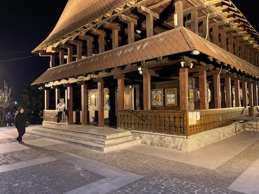 Seara noastră aici, la așezământul în stil maramureșean, a început cu o alarmă în loc de clopot, după ce „oamenii bisericii” au uitat să o oprească înainte să se apropie de ea. Scena a continuat și cu reversul medaliei, la scurt timp ajungând și reprezentantul firmei de pază care ne întreba agitat dacă cei care au intrat sunt sau nu „de-ai bisericii”.