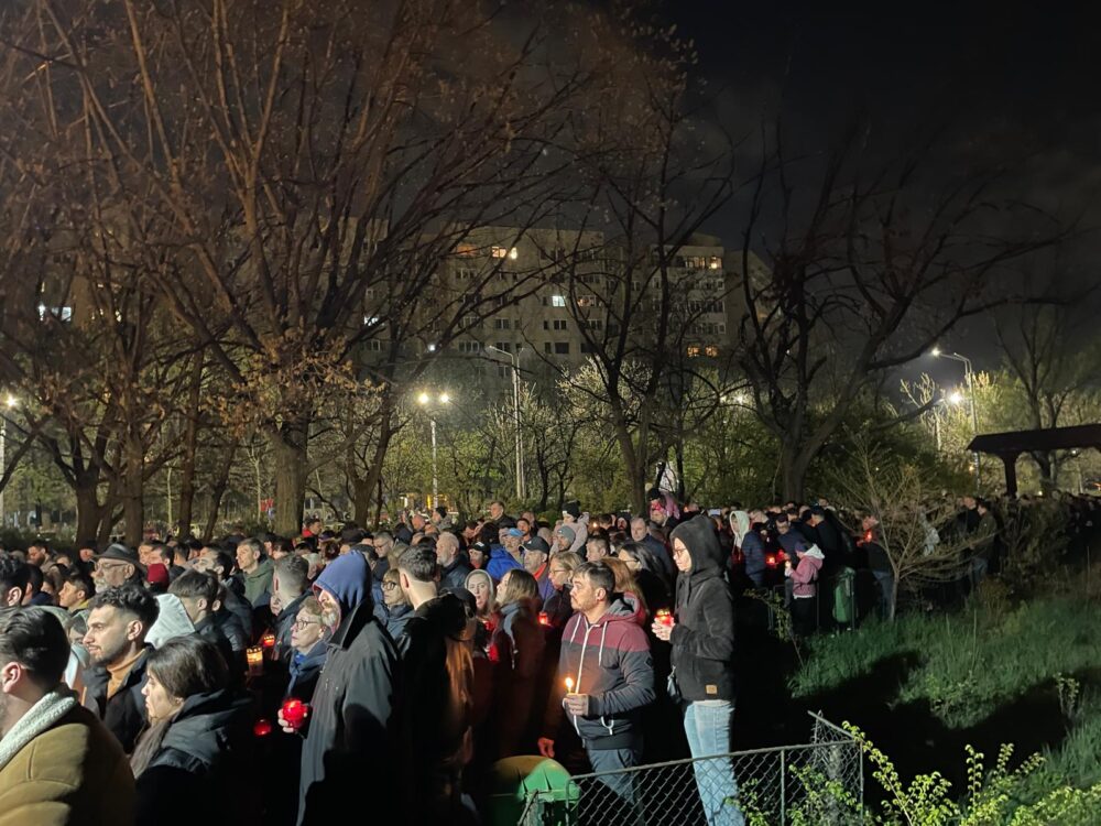 Sute de oameni au întâmpinat Învierea lui Iisus în biserica de lemn din zona retrocedată a Parcului IOR. Curtea a devenit neîncăpătoare atunci când preoții au început să împartă lumina sfântă, moment în care toți s-au îmbulzit să prindă printre primii darul speranței.