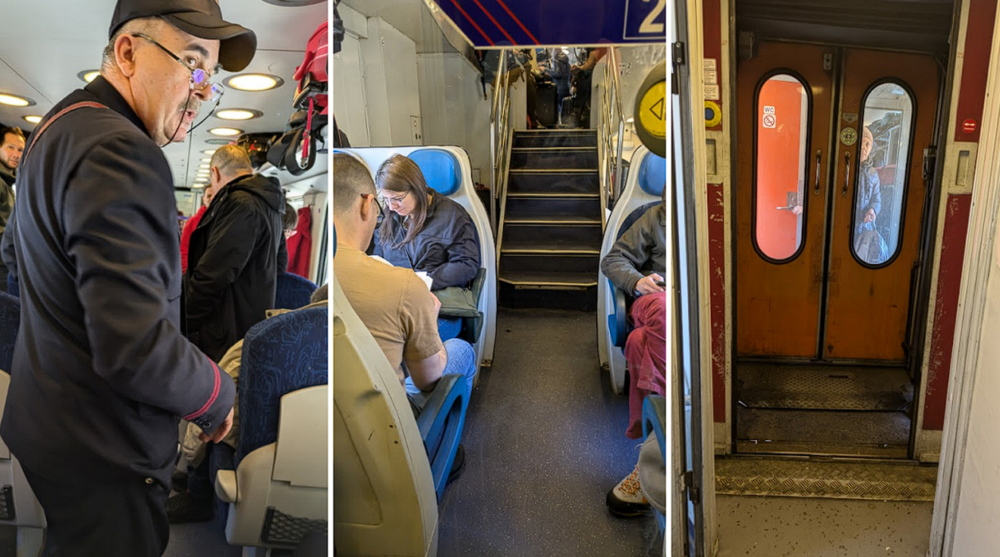 Controlorul de bilete este de-a dreptul exuberant, ține discursuri nesolicitate și compensează lipsa de aer cu glume la limită. Îl întreb unde-i toaleta și îmi ține o lecție întreagă. Îl înțeleg, trebuie și el să se distreze cumva.
