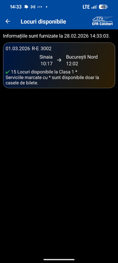 E aproape ora 15:00 și constat că trenurile cu plecare pe la prânz, a doua zi, de Mărțisor, sunt deja sold out. Nu mai găsesc decât la trenuri cu plecare duminică dimineață, la prima oră.
