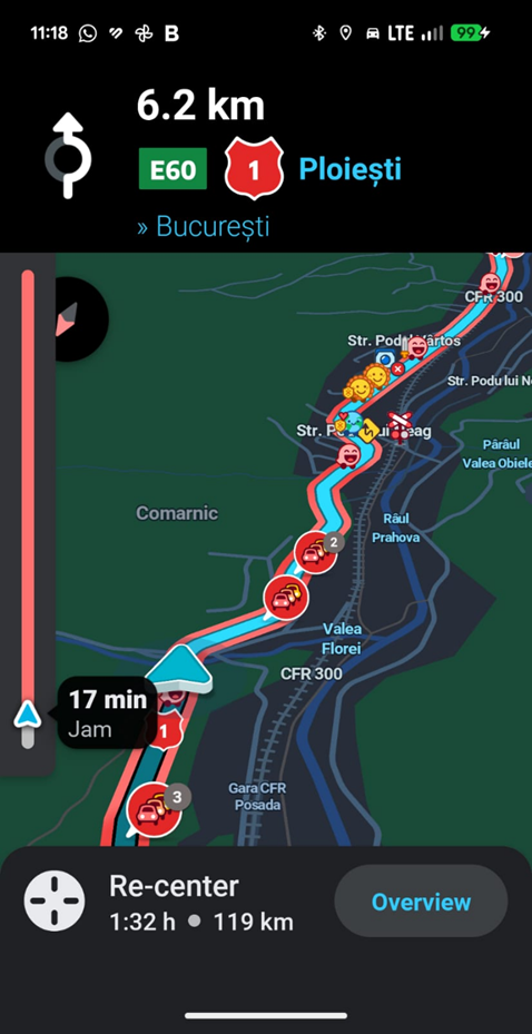 În acest timp, pe DN1, coloanele de mașini staționează pe kilometri. Totuși, călătoria pe șine, deși plină de neajunsuri, garantează un timp de parcurs mult mai scurt și limitează poluarea masivă generată de motoarele pornite în blocaje.