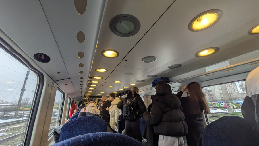 Odată cu apropierea de București, culoarele se blochează din nou. Oamenii se ridică de pe scaune cu mult înainte ca trenul să ajungă la peron, împinși de o frică absurdă că vor rămâne sechestrați.